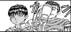 - El chiquillo bromista: El hijo de Guts. El comienzo de su vida es ser un Gasparín deforme, que aparece a veces para pedir a Guts ayuda con los gastos médicos o para jugar a los sustos. Conoció a su amigo Don Nadie Cabeza de Huevo en un incidente con una torre de la Inquisición, que se inclinó por el peso de la espada de Guts. Ese día, su energía fue reciclada para que esta forme con arcilla mágica el cuerpo nuevo de Griffith y este pueda nacer de un huevo. El chico no puede aparecer excepto que Griffith se olvide de tomar sus pastillas, lo cual le ocurre frecuentemente ya que anda muy ocupado con su sueño. Es el único personaje, aparte de Schierke, con el poder de detener a Guts cuando entra en modo mandril con rabia.