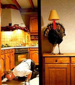 Bueno, acerca de ese plato. Ese plato lo iba a usar para lavar mi pavo. En esos días a los pavos se les llamaba pájaros gordos. Siempre comíamos pájaros gordos el día de gracias y con todos los accesorios: ciruela, ensalada de piña y panecillos rellenos de pólvora... Y luego nos íbamos al sillón a ver el fútbol, que en esos tiempo se llamaba beisbol