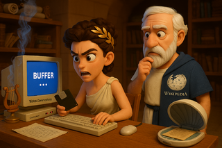 —¿Por qué está todo en dórico? ¡Yo lo dejé en jónico! —exclamó mientras trataba de buscar el botón de "Aceptar" en un menú que decía: Σφάλμα μνήμης: πάπυρος δεν ανταποκρίνεται ("Error de memoria: el papiro no responde").