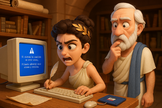 Pero Vista tenía otros planes. Los programas tardaban una eternidad en abrirse. Cuando Hipatia intentó cargar su modelo astronómico, el sistema respondió con “Preparando la aplicación... por favor, espere” durante 40 minutos. El sistema requería más recursos de los que tenía la Biblioteca. Ni el servidor del templo, ni los discos de cerámica, ni la paciencia de los filósofos podían sostenerlo. Cada acción requería permisos absurdos. Al intentar abrir un papiro digitalizado, el ordenador preguntó: “¿Está seguro de que quiere leer esto? Confirmación de administrador requerida.” Davo intentó instalar VeritasOS en secreto, pero Vista lo bloqueó. “Sistema no autorizado. Vuelva a intentarlo en el siguiente ciclo astronómico.” Hipatia dejó escapar un suspiro filosófico. Era el fin de una era.