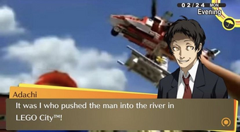 | Yu Narukami: Un protagonista que actúa de forma serena todo el tiempo, aunque cabe la posibilidad de que sea un robot sin alma y de corazón frío. Yu es tan buen amigo que, a pesar de perseguir a un asesino en serie, se toma la molestia de ayudarte con tus problemas psicológicos, y es tan bueno en eso que incluso convence a su propio tío de que puede casarse con su prima... Espera, ¿Qué mierda? | |