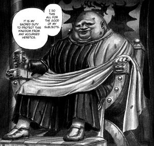 Al llegar a un pueblo le sangra nuevamente su tatuaje, y encuentra sentada sobre una tarima una albóndiga blanca con patas y cara de Humpty Dumpty que organiza decapitaciones (había una fila de gente que se reía a carcajadas porque contaron un chiste de zanahorias que Guts no entendió). Guts le lanza la cabeza de la rea con un mensaje de amenaza para este Humpty Dumpty con elefantiasis, llamado El Conde Oloragrasa. El Conde ordena su detención y su lameculos personal envía unas tropas lideradas por un tal Zondark que cae con más pena que gloria con todos sus soldados después de hacerse como que es Alejandro Magno y Leónidas.