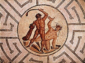 Teseo pidió prestado uno de los palos de golf de Minos y esperó con Fedra en la entrada del Laberinto. En el interior podía oír chillidos y gruñidos y luego silencio. En ese momento apareció Ariadna sosteniendo un trozo de hilo.