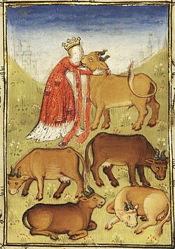 Pasífae persuadió a su esposo para que se fuera de viaje de negocios o de incursión a Grecia y organizó su encuentro con el toro. Para ayudar a moverlo, Pasífae ató a sus otros sirvientes y soldados para empujarlo hacia un campo y erigió una pantalla alrededor. Fuera de la vista de cualquier otra persona, Pasífae se quitó la ropa y se colocó en posición. Nana también se quitó la ropa y se puso la túnica de la reina con una capucha levantada para que nadie pudiera ver el interruptor. Se quitó la pantalla y sonó una campana. Ésta fue la señal para que Dédalo e Ícaro llevaran al toro al campo con la multitud bien retenida. Se había animado a todos a que trajeran sus instrumentos musicales que también enmascararían cualquier sonido humano sospechoso proveniente de la vaca.